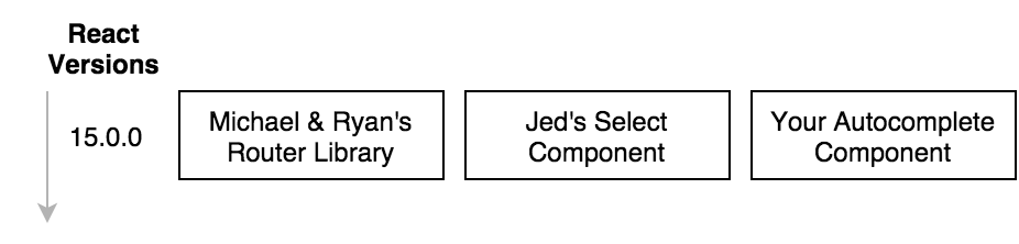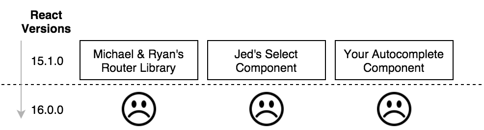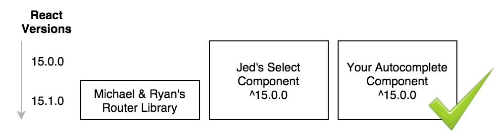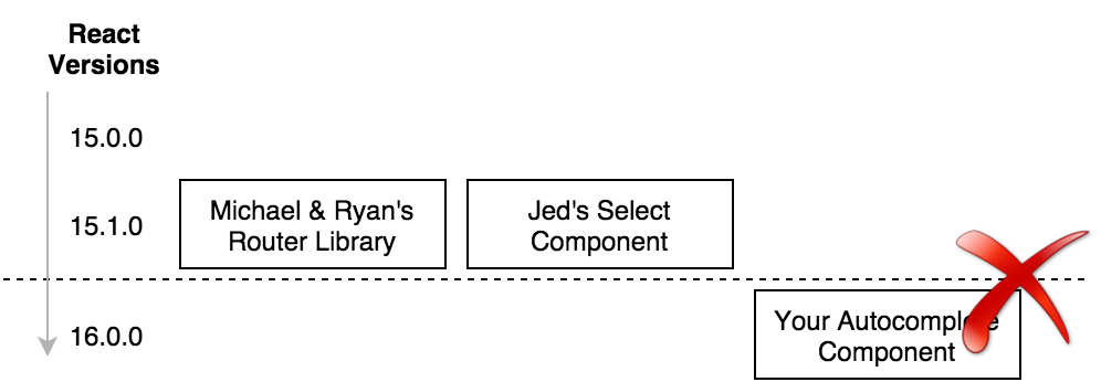 If you try to upgrade your component to 16.0.0 you might find that your application no longer works if you still have other dependencies. E.g. if Ryan’s and Jed’s components are only compatible with 15.x.x.